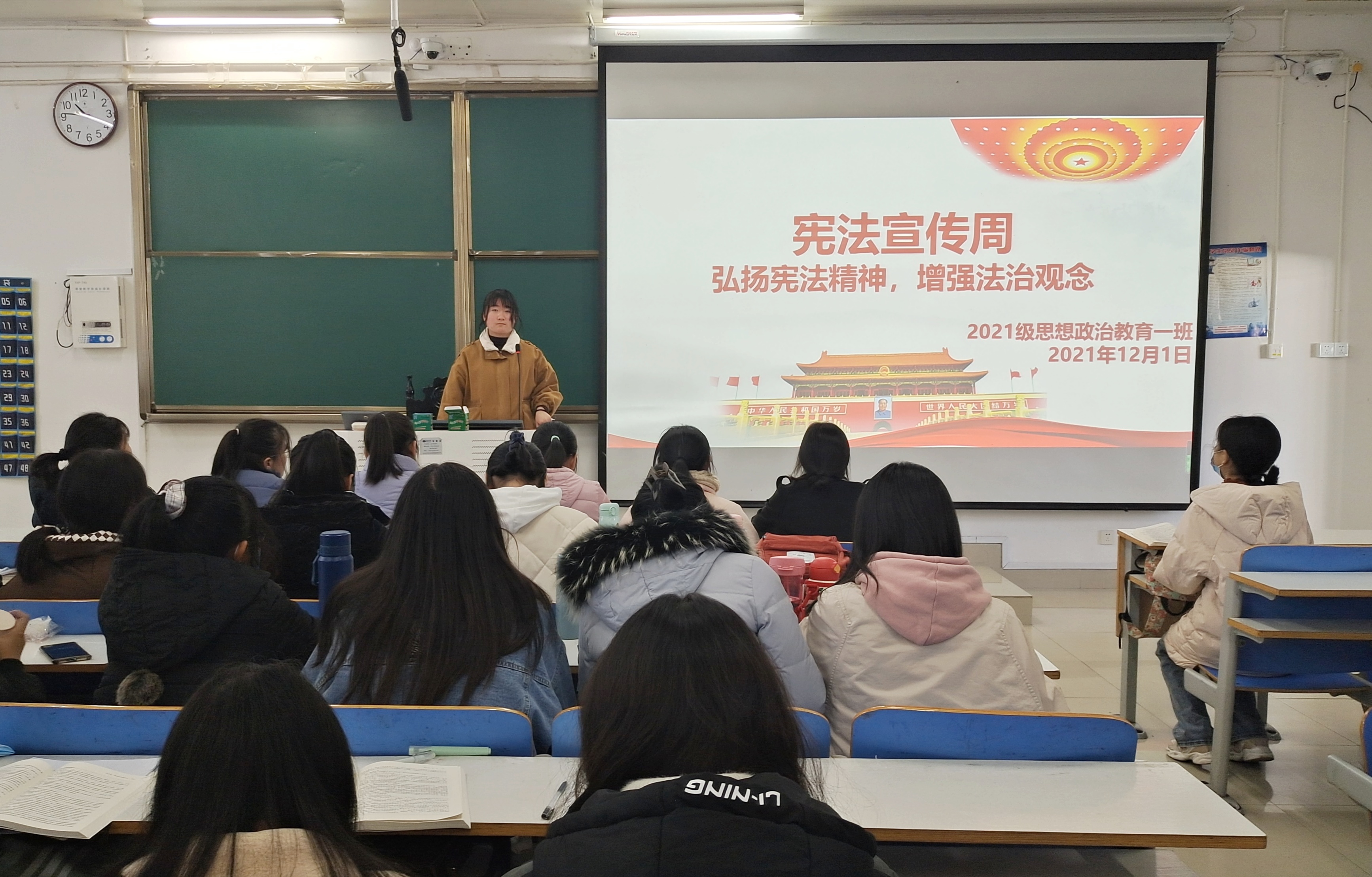 为增强同学们的法治观念,学习贯彻宪法精神,12月1日上午,sunbet中文官网2021级思想政治教育一班在社科楼514教室召开“弘扬宪法精神,增强法治观念”主题班会。2021级思想政治教育一班全体成员参加本次班会。班会由副班长雷敏主持。